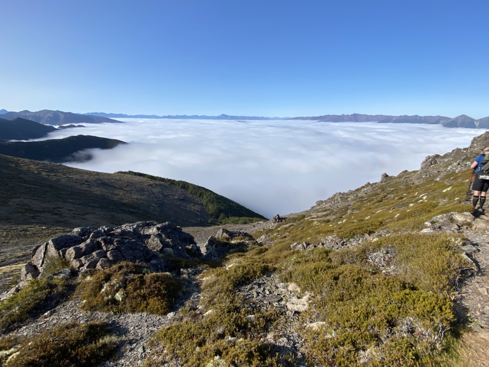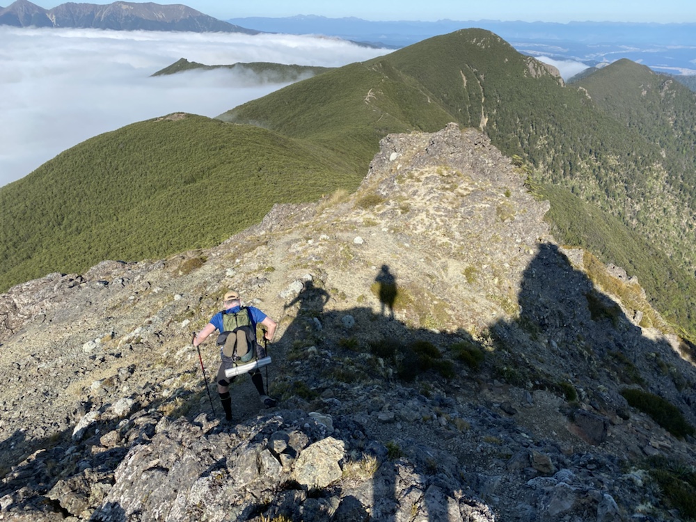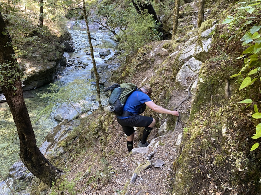 From yesterday’s glorious day to the longest day. An 11.5 hour day from 07:30 to 19:00, covering 26km with about 1000m climb. The track gave us: scree, very steep slopes, root ladders, rock scrambles, narrow ledges, steel rope protected traverses, shoe wetting river crossings, river bed travel. The Europeans exclaimed at a rest stop that this was not walking, but didn’t have a word for it. Welcome to New Zealand “tramping”. In the hut tonight are Freya, Anise, Holger from Germany, Stefan and myself.