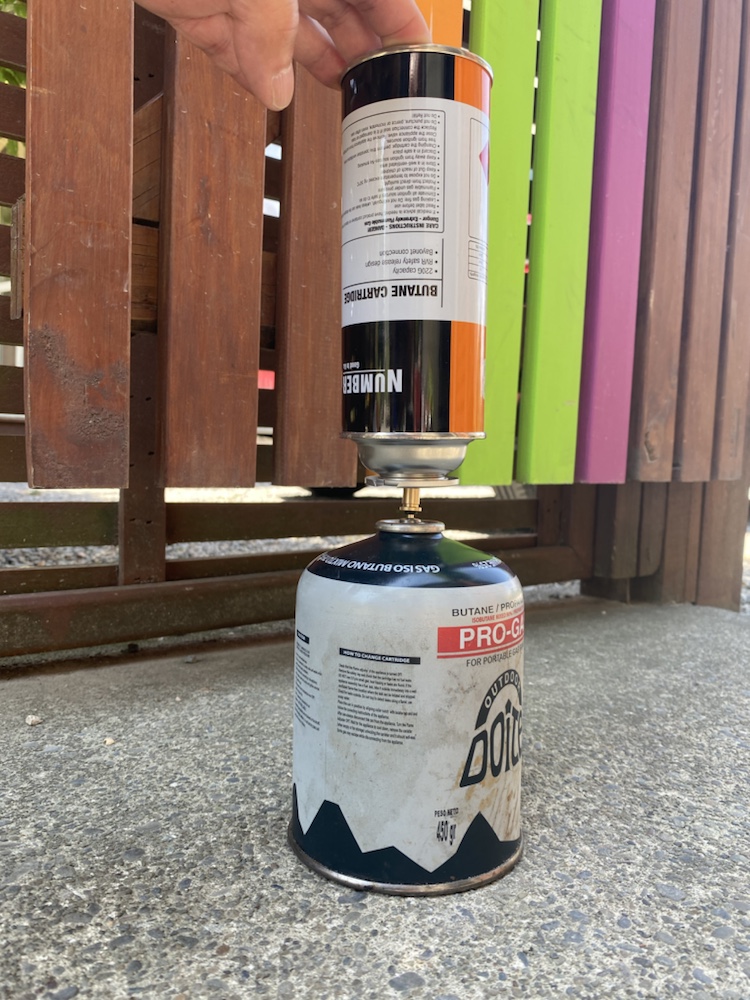 Gas stoves are the easiest form of cooking on the trail, but when you are trying to minimise weight, there is always the problem of what to do with nearly empty canisters. Do you dispose of it or take it with you to use for a few days and then carry it out as rubbish? I found a solution which will never be recommended by the manufacturers. I bought a small gas refill adapter on eBay that enables refilling the screw thread canisters from the aerosol type canisters. The aerosol canisters are much cheaper, but they don’t have propane/butane mix for low temperatures, however this isn’t an issue in summer. It helps putting the canister receiving the refill in the fridge first. So I now have a refilled canister to last me at least the next week and with the spare gas Steve has some of his canisters refilled.