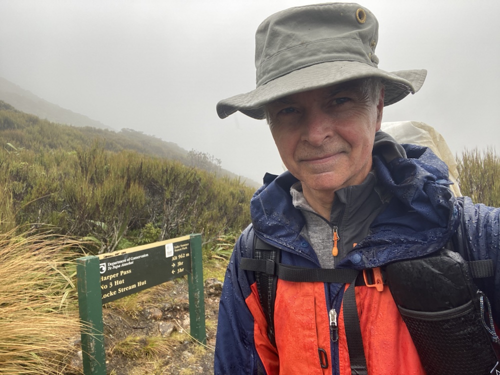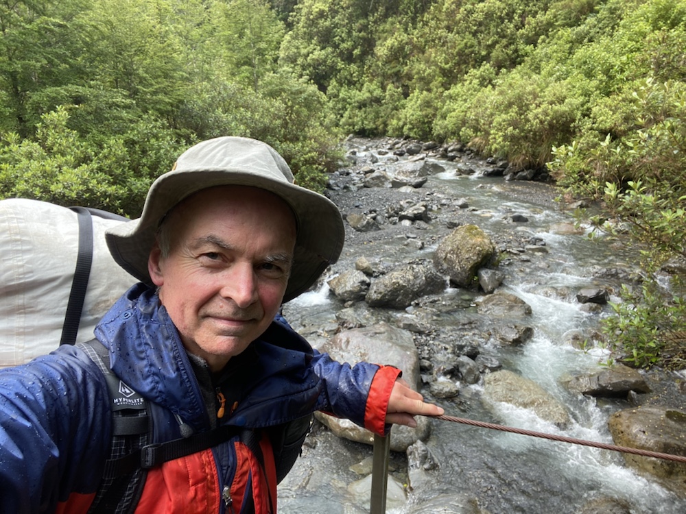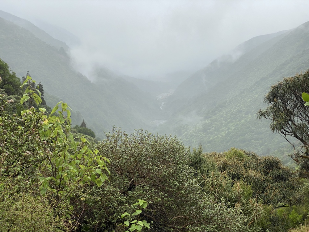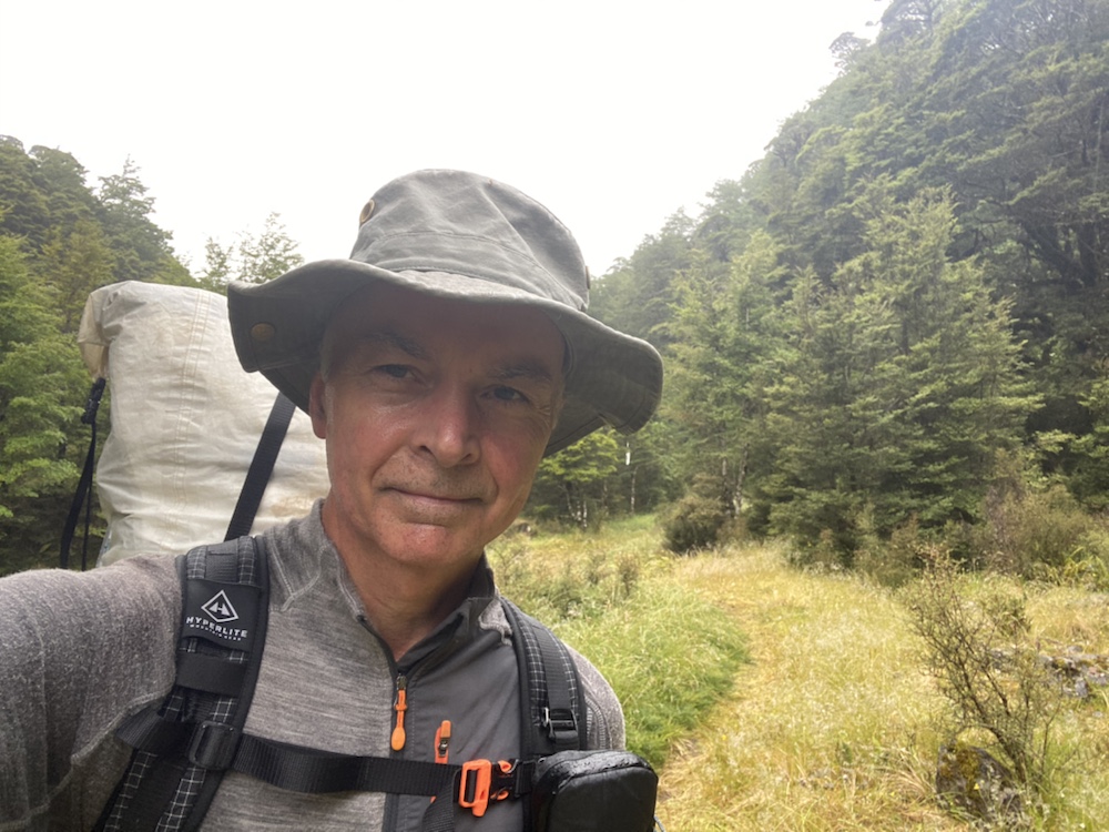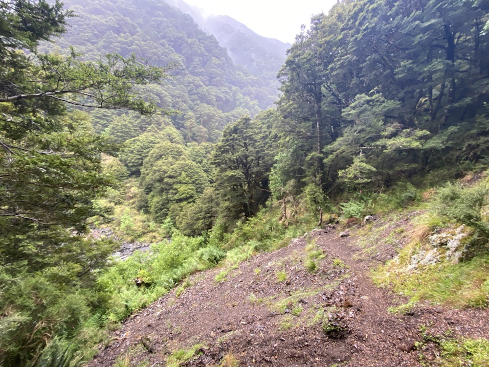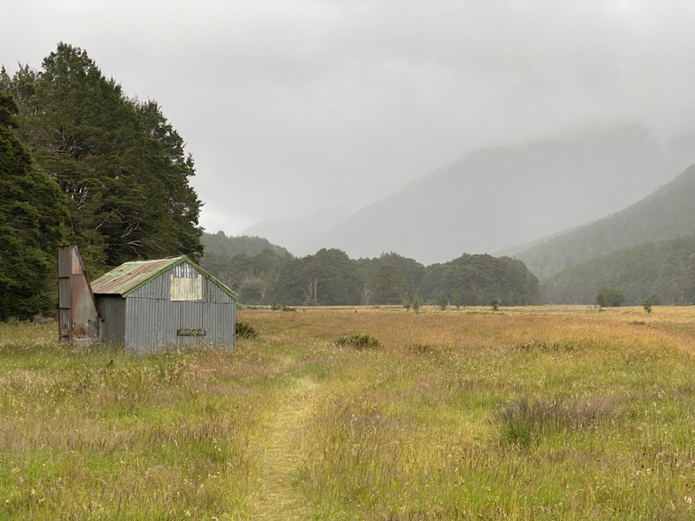 2 Feb. 08:00 departure following Demelza and Rau. First day of real rain, which initially was very light. Temperature was about 20C so it felt close and I didn’t need my waterproof jacket for a while. I passed Demelza and Rau after a couple of hours of grass flats and beech forest and stopped at Harper’s Pass bivvy for a quick snack at 11:00. The track was overgrown with vegetation so shorts and boots were soaking wet. Waterproof on from there as it was a bit cooler with the stronger wind going over Harper’s Pass. The descent was much steeper than the climb, but the trail flattened out to hug the Taramakau River down to Locke Stream Hut, built in 1940 and preserved as an historic hut.