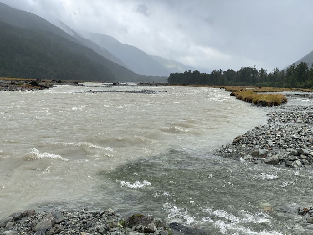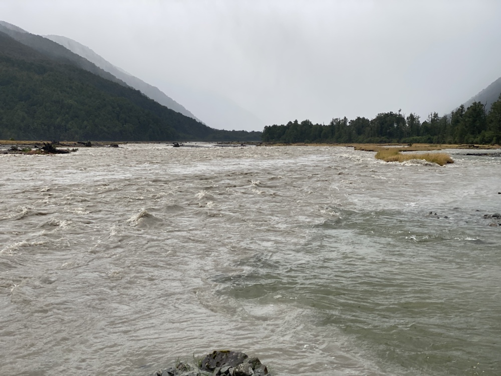 4 Feb. A warm night sleeping on a top bunk in the hut, interrupted by the sound of heavy rain on the corrugated iron roof. It was about 09:00 before anyone got out of their sleeping bag; everyone knew that we were going nowhere today. I donned my wet gear and took a walk down the river. The relatively easy crossing we made of the Taramakau River yesterday was now double the width and twice the speed. Whereas yesterday the water was clear enough to see the river bottom, today it was milky due to sediment washing down. With more rain still to come, we could be here some time.