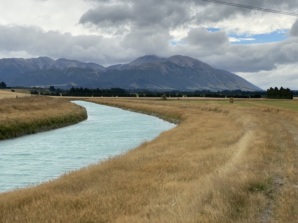 16 Feb. A day waiting for the worst of the cyclone to go through. Late morning I had a leg stretch (without pack) 9km around the Methven Walkway which circles the town. It was a dry day with strong winds and dark clouds hanging over the mountains.