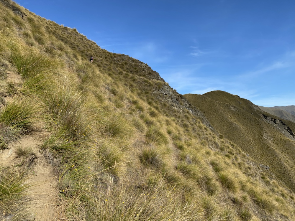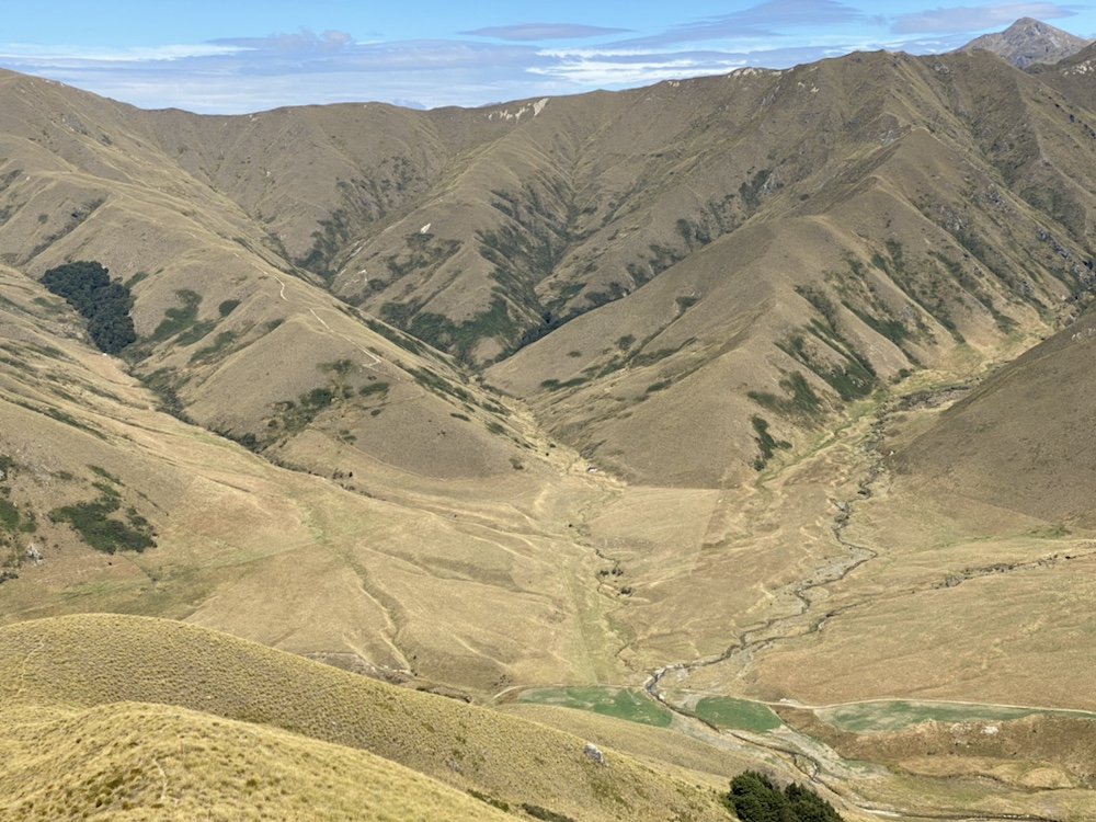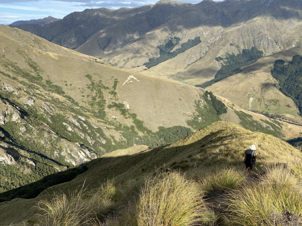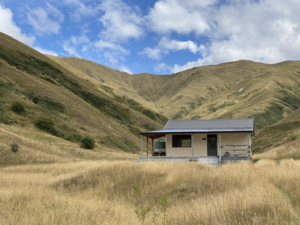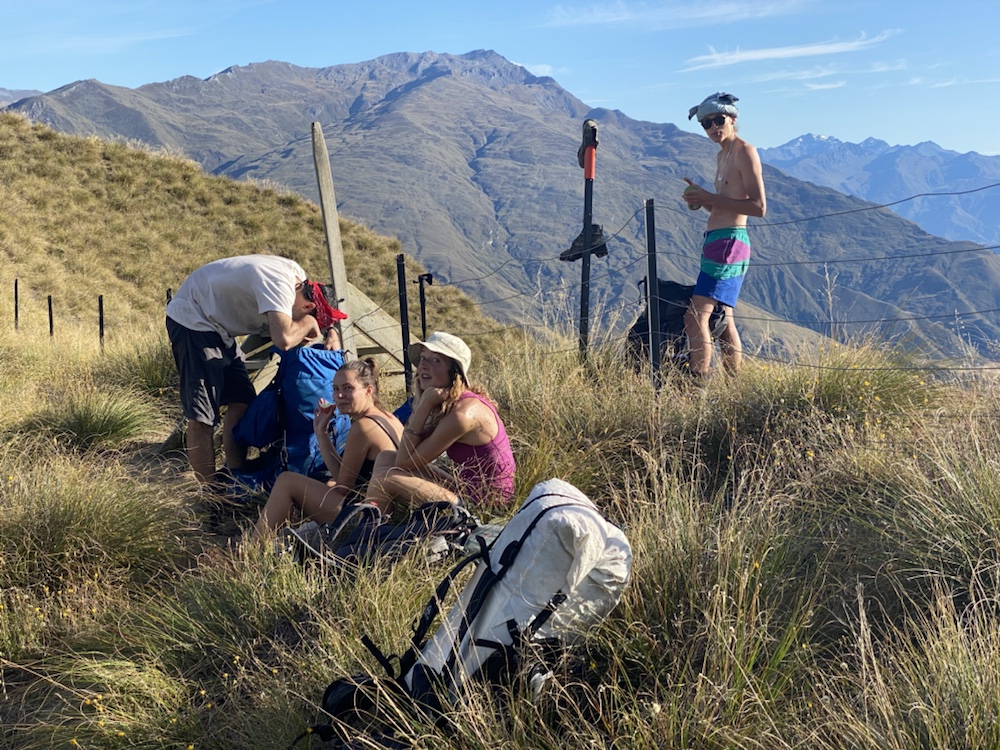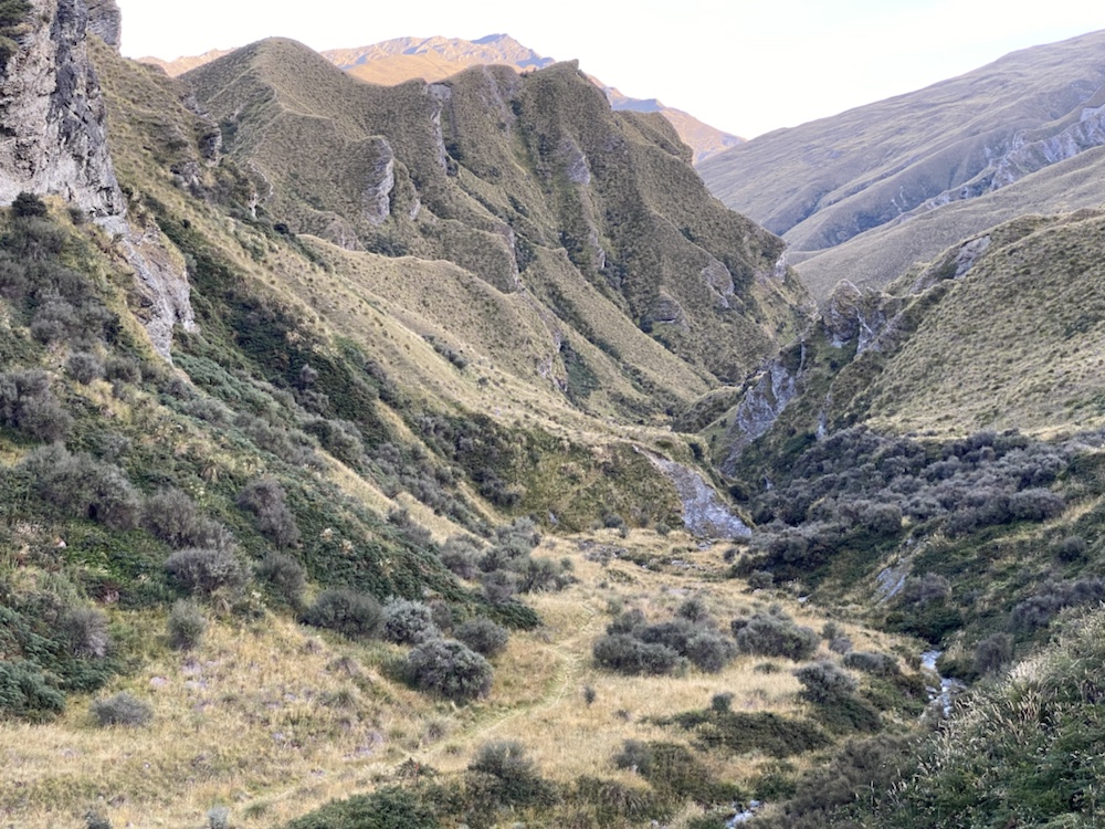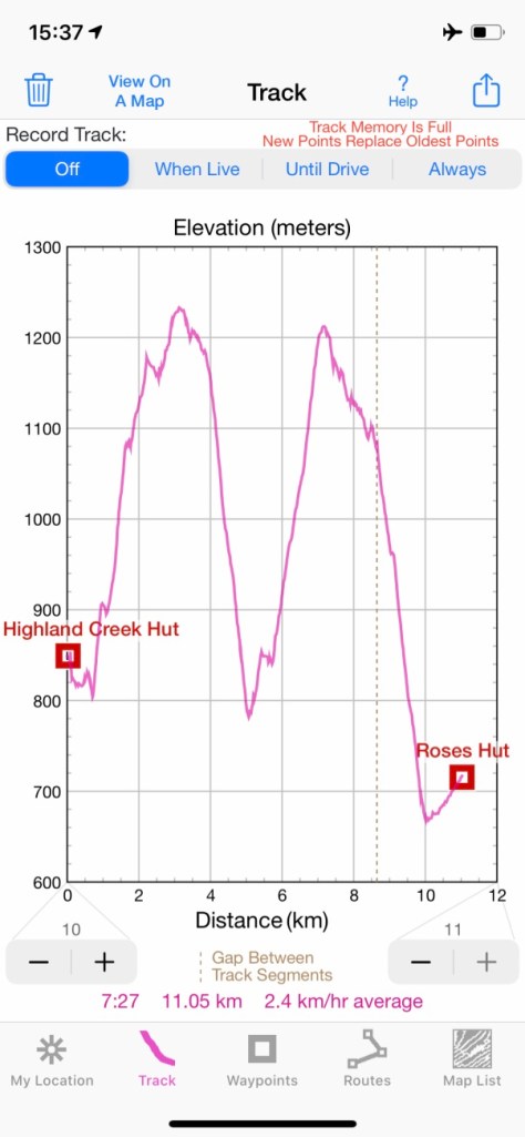 25 Feb. A good night’s sleep apart from a couple of possums scrapping on the hut verandah. Today there were two options. The first was to Roses Hut, 11km with two big 420m climbs and descents and the second option was to do that and push on past Roses Hut to camp at Macetown, another 10km and a 470m climb and descent. Silvi and Emric made an early start at 07:00 with the intent of a long day. The rest of us set off not far apart at 08:10.