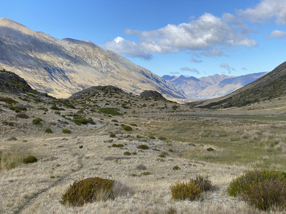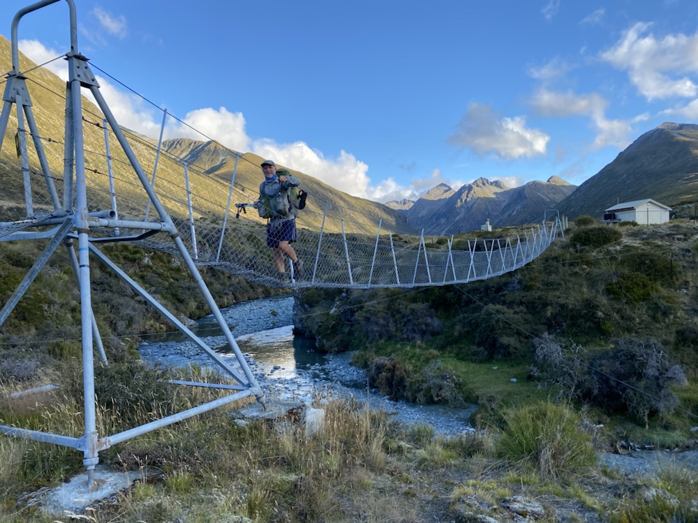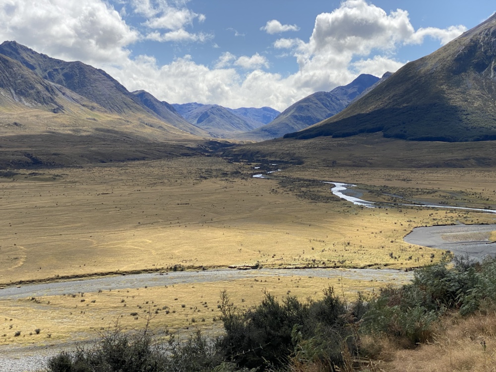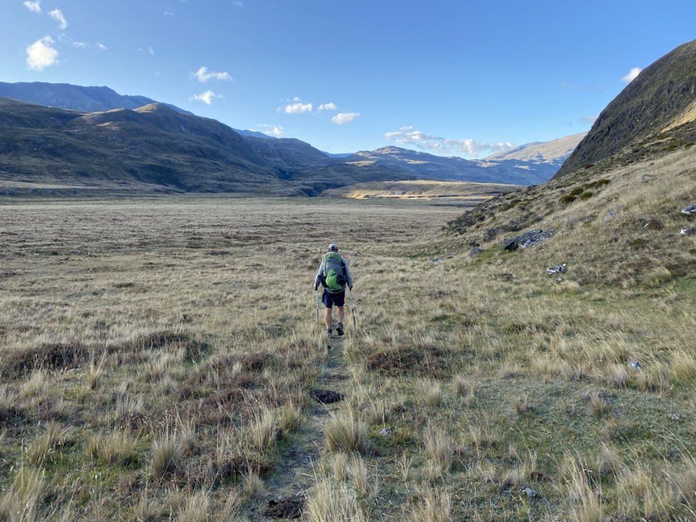The route took us through the large glacial valley of the Mararoa River. Big vistas and fortunately blue skies. A very strong breeze on our backs kept a comfortable body temperature.