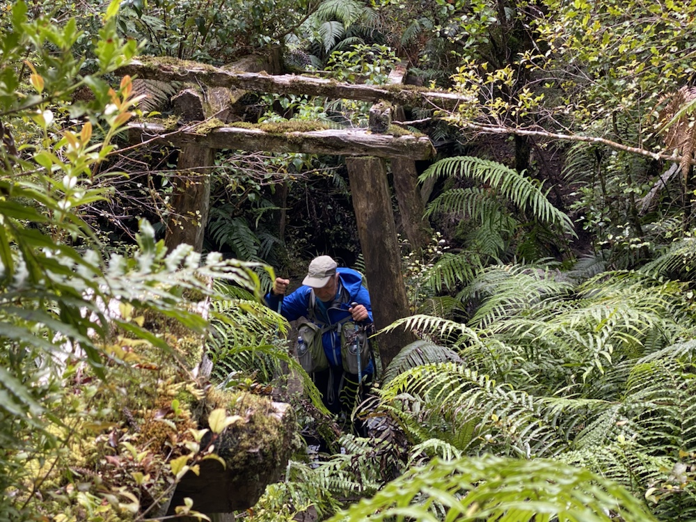 The route today was down the hill for a couple of km and turn right along the Ports Water Race Track. As an old mining water race, it followed a contour so no climbs, but it did meander and involved scrambles in washed out sections, so we needed to walk 15km to cover 7km grid squares.