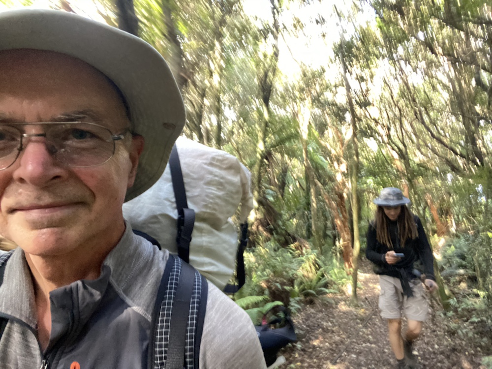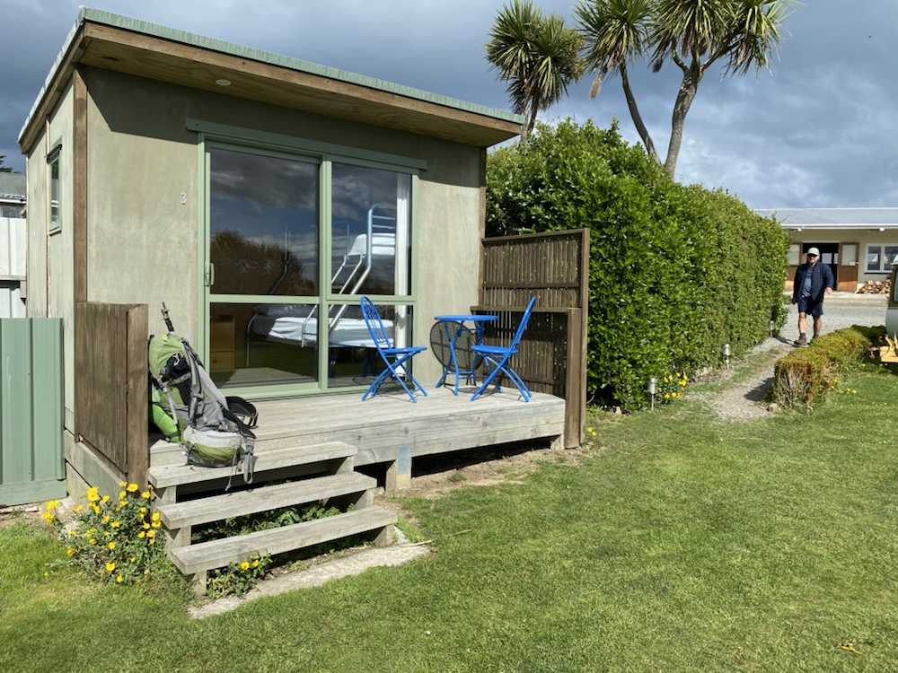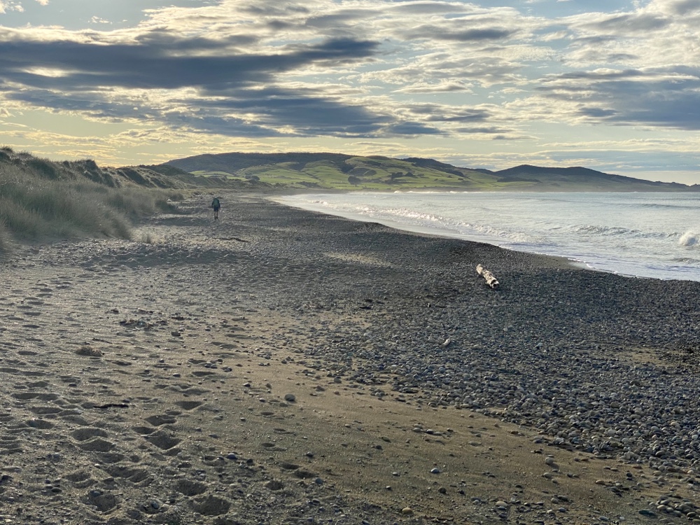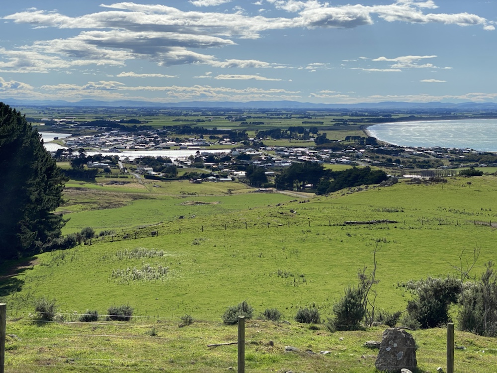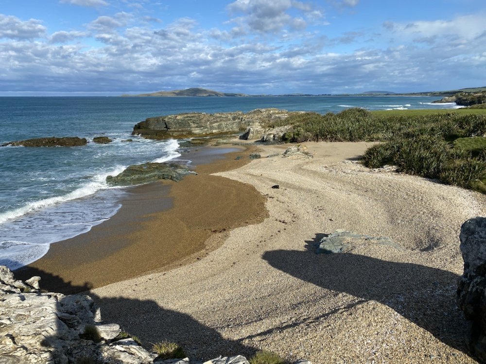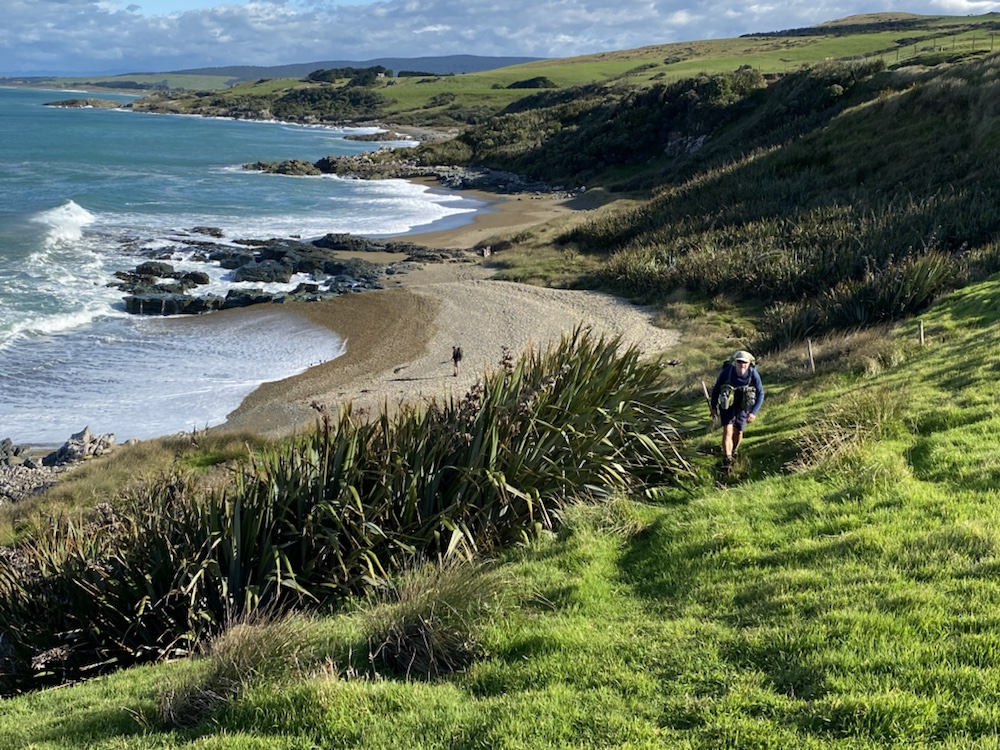19 Mar. It was going to be a short walking day, so we had a slow start from the campsite bunk room and we were walking at 08:40. In the group were Richard, Josh and Nina. Down to the beach and then along the bay for about 6km. Much of that was pebble beach walking but the track took us over low cliffs with some great views back down the bay. At that point, all that remained was a short climb through Mores Scenic Reserve and the drop down into Riverton. The Holiday Park was on our walk in to Riverton on aptly named Richard Street.