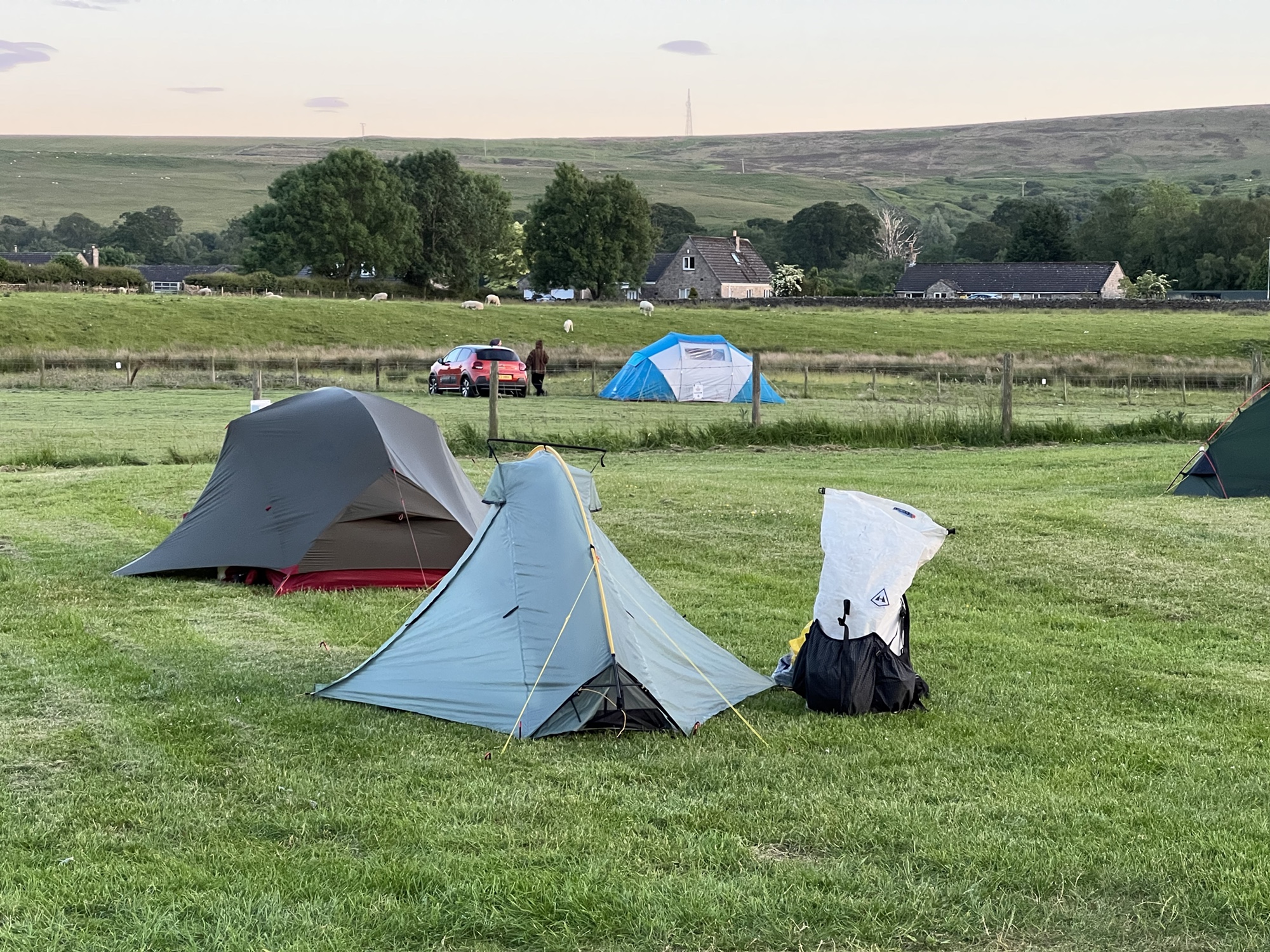 There last couple of km into Bellingham were on roads and we arrived at Demesne Farm campsite at 1820. Drying out damp tents and showering meant we just got to the Cheviot pub before last food orders at 2000.