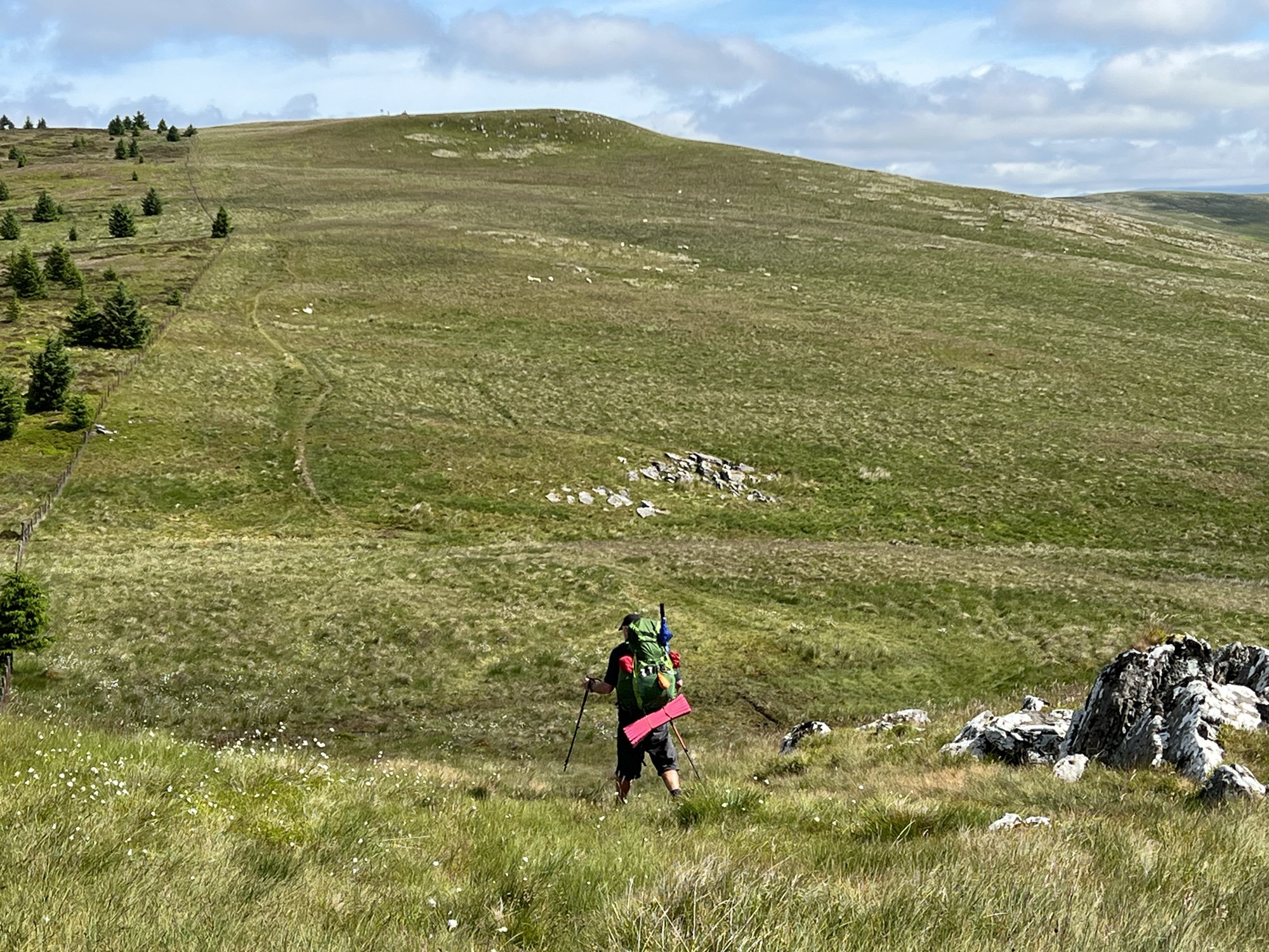 From Byrness it is a 300m climb on to a ridge in the Cheviot Hills and the route follows the English/Scottish border. The walk today was undulating so we had about 600m off climb in total. A nice cooling breeze was with us all day.
