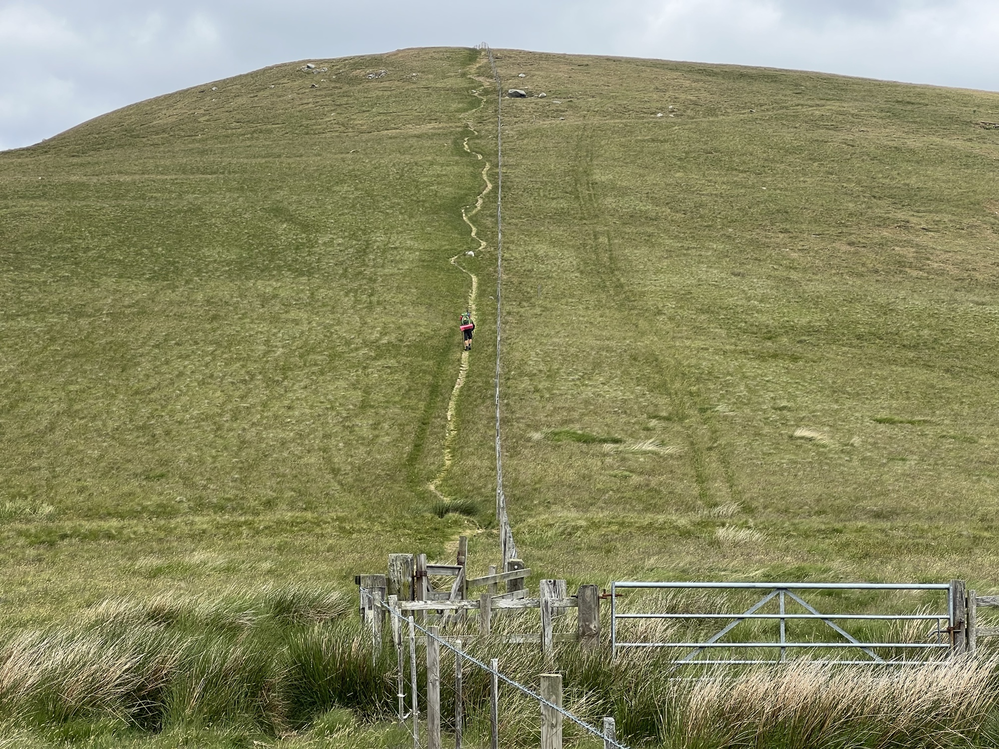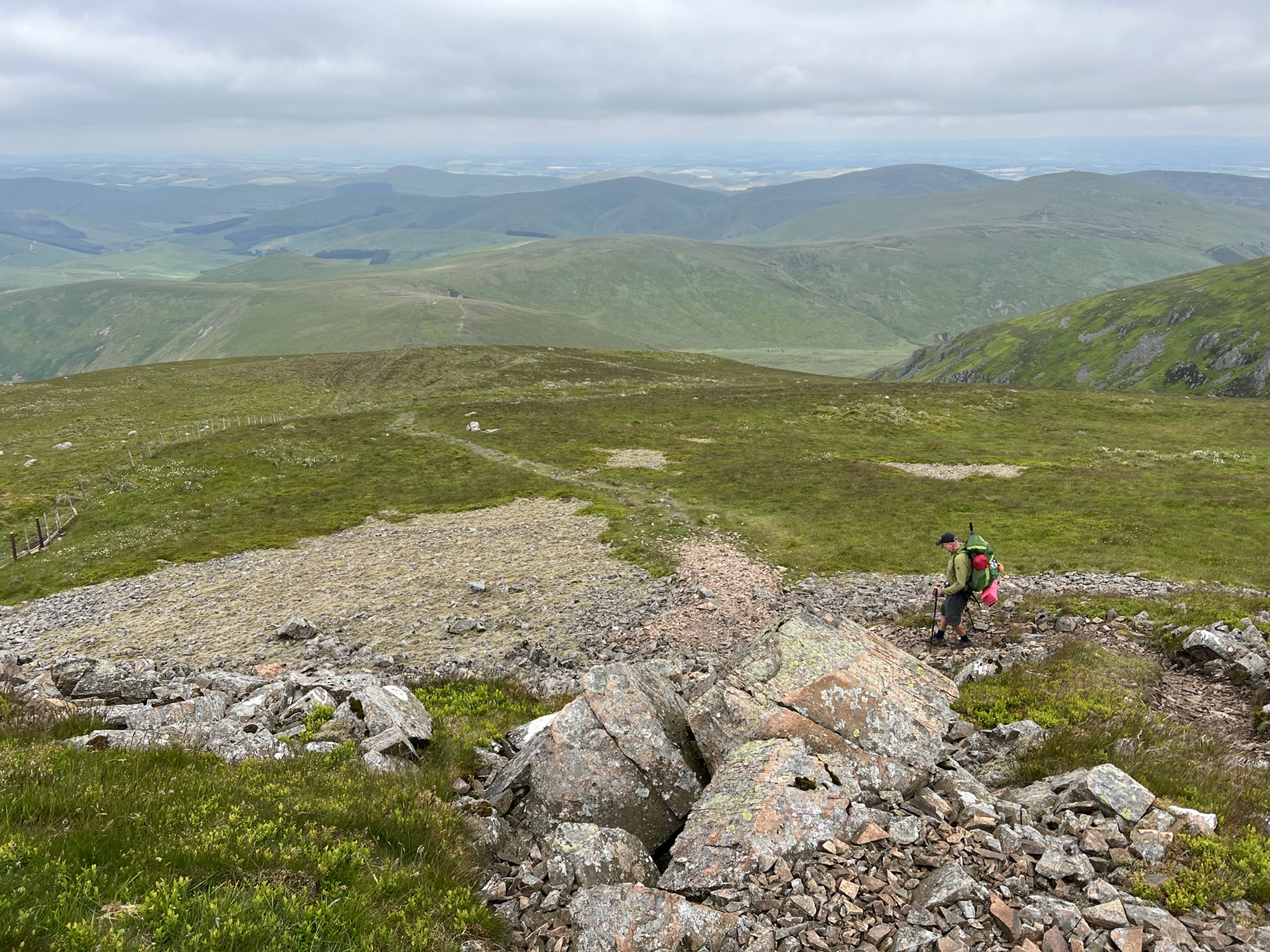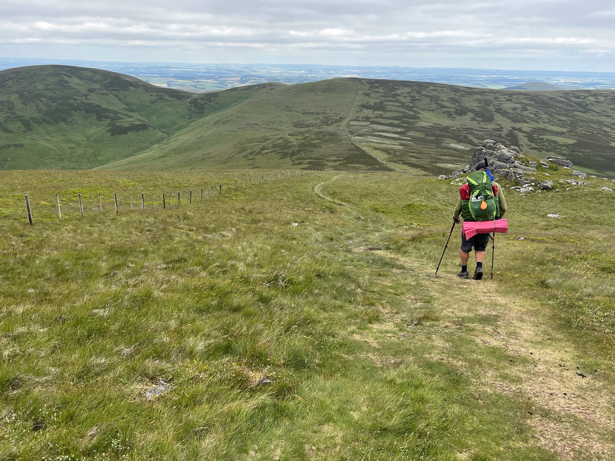 At 0815 we had reached the junction for the Cheviot (815) 4km side trip ascent. We dropped the packs and made it up and down in 50mins. Nothing to see on top due to low cloud. Then back to a slower pace with packs. The route was similar to yesterday over knolls and saddles. Even with a generally descending day, there was over 600m of climb.